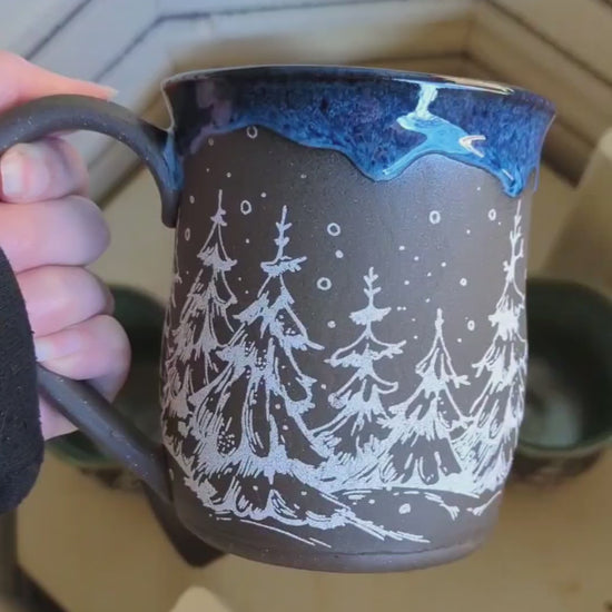 Featuring a design of pine trees in the snow that contrasts against a matte dark chocolate brown clay. With a sky blue and frosty white glaze lining the interior and mug rim.